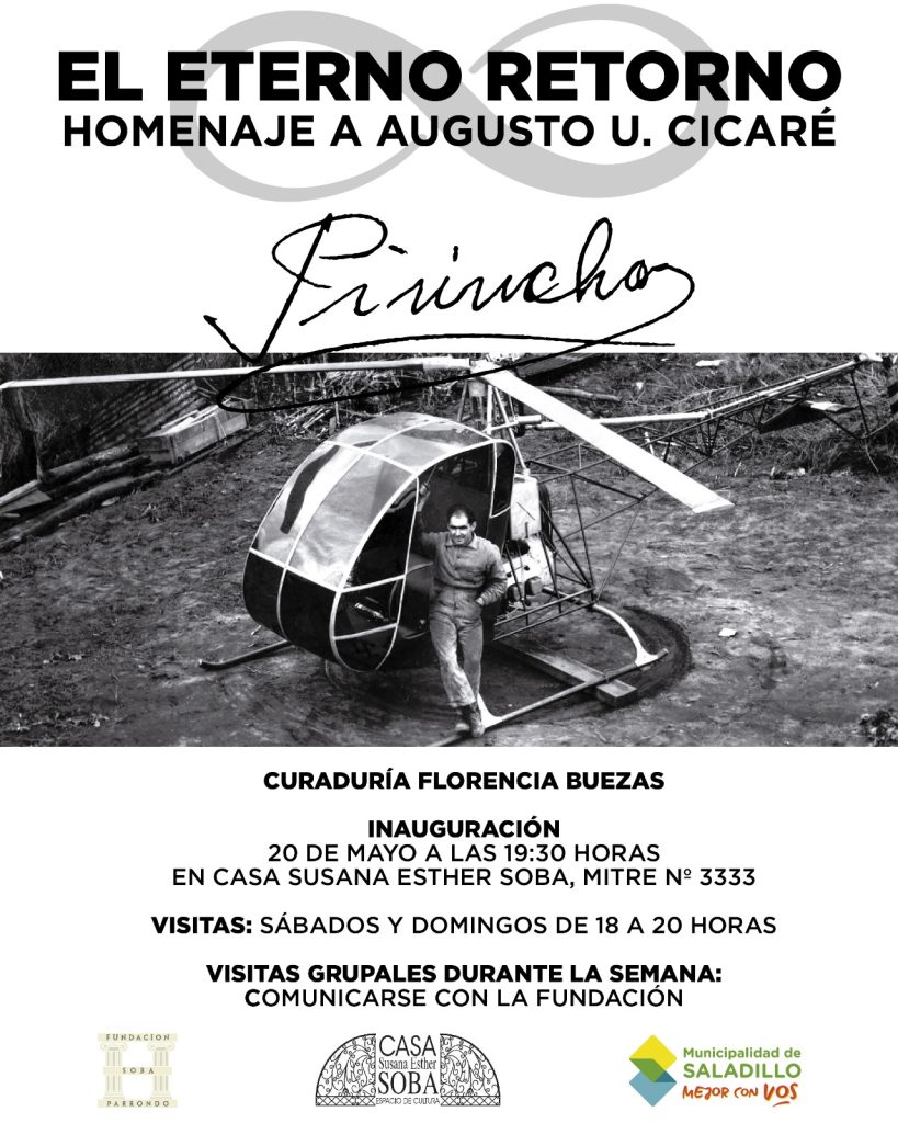 Fundación Soba Parrondo en colaboración con la Dirección de Cultura y Derechos Humanos, realizará la inauguración de la exposición Homenaje a Augusto U. Cicaré, el 20 de mayo a las 19:30 hs., en Casa Susana E. Soba, Mitre N° 3333, Saladillo (BA), enmarcada en el mes aniversario del natalicio de Pirincho y en el recorrido cultural por la Noche de los Museos.